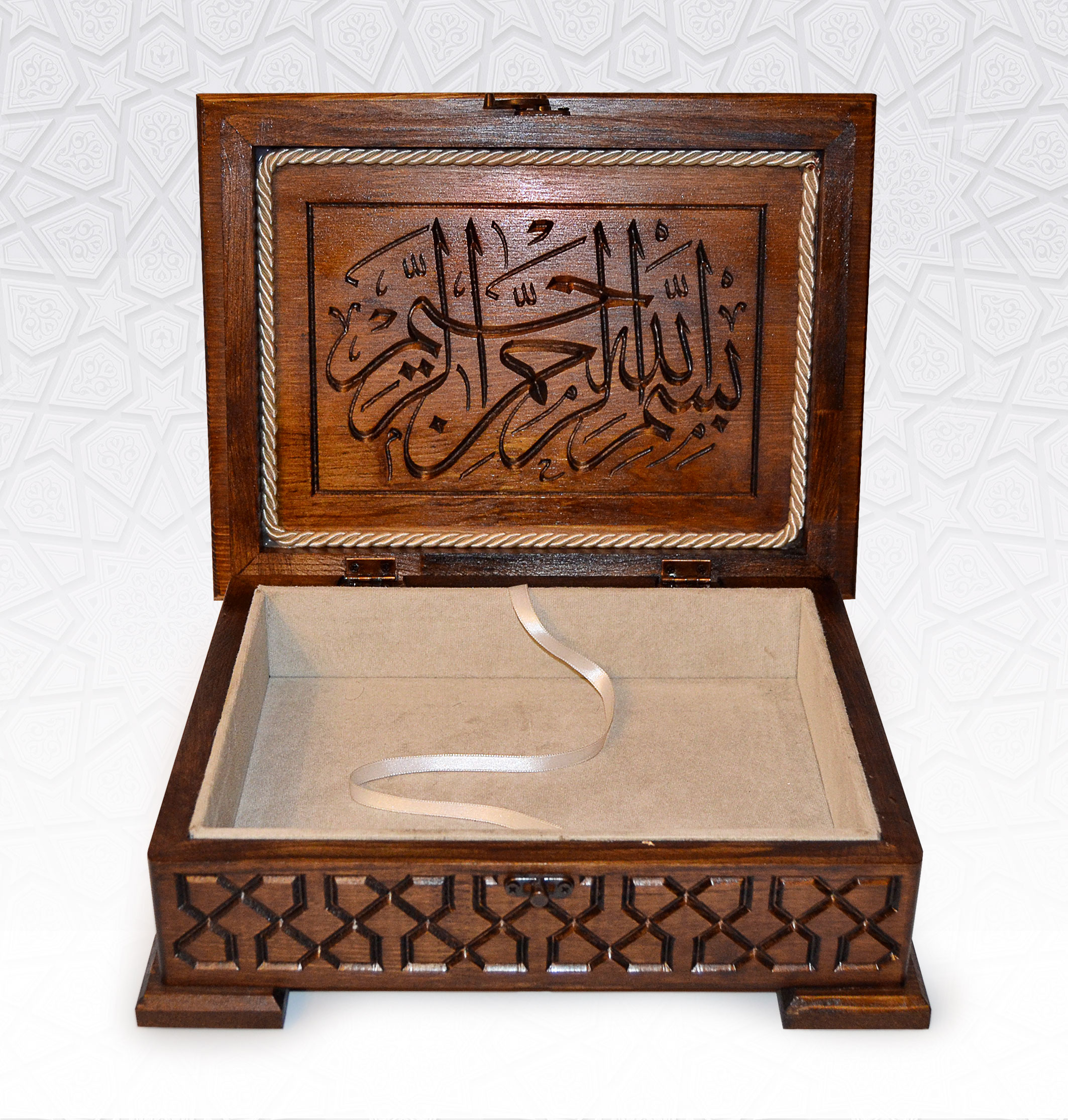 ÜRÜNÜMÜZ KIZIL ÇAM AĞACIN DAN ÜRETİLMİŞ OLUP CNC OYMA TEKNİĞİ KULANILMIŞTIR ÜZERİNDEKİ DESENLER SELÇULU OYMA MOTİFİ UYGULANMIŞTIR İÇERİSİNE HAT YAZI OLARAK BESMELEYİ ŞERİF YAZILIDIR AHŞABIN DIŞ RENKLERİNE GÖRE İÇ KADİFE RENKLERİ DİZAYN EDİLMİŞTİR SANDIK İÇ ÖLÇÜSÜ.ENİ.19.CM.BOYU.27.CM.DERİNLİK.55.MM .DİR.